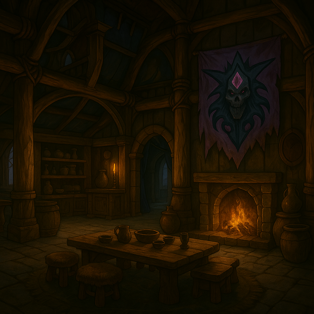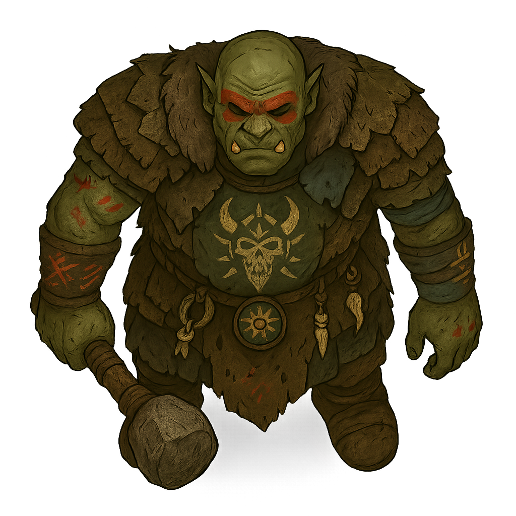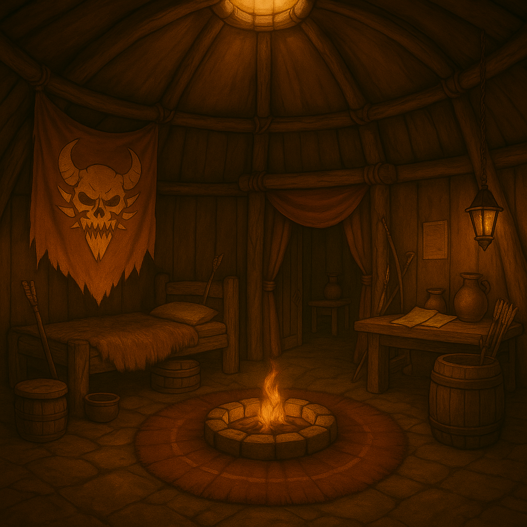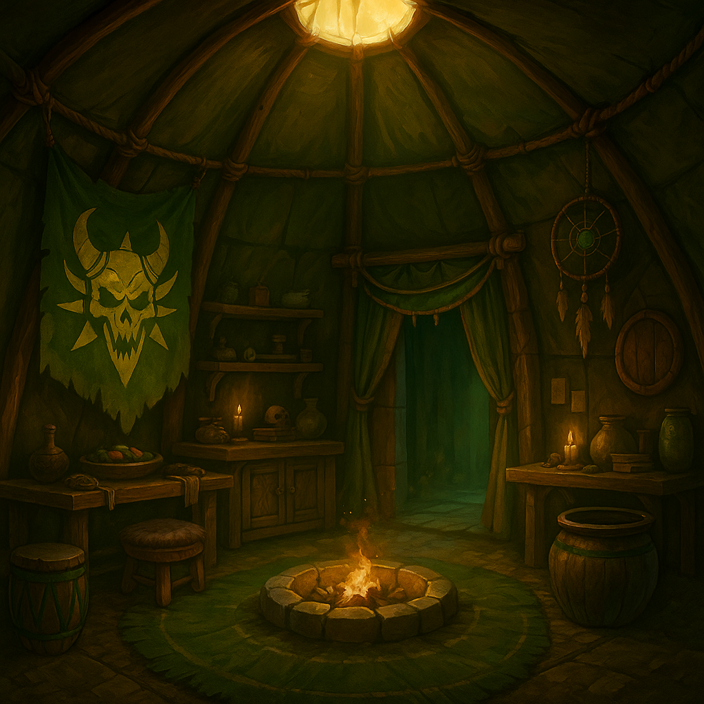 Color is just as important as form. Every clan has its own palette and symbols, expressed through dyed fabric, painted wood, stitched hides, and carved decorations. From a distance, an orc can often tell who lives in a structure—what clan they belong to, what rank they hold, even what battles they may have survived—simply by reading the colors and patterns. The most common materials are leather, wood, cloth, and rope. These are chosen not just for practicality, but for meaning. Nothing is wasted. Stone and metal are rare and carry weight, both literal and symbolic. They appear only in ancient temples, lost strongholds, or the homes of legendary leaders—where every brick speaks of blood, power, and legacy.