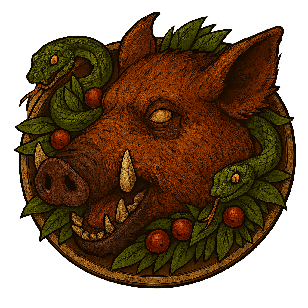 A traditional high-status meal served during war councils or midwinter feasts. The severed head of a wild boar is presented intact, its mouth still snarling. Curled around the skull are fresh jungle serpents—skinned but served raw—accompanied by bitterleaf and bloodberries. The snakes are eaten whole, often while still writhing, for good luck.