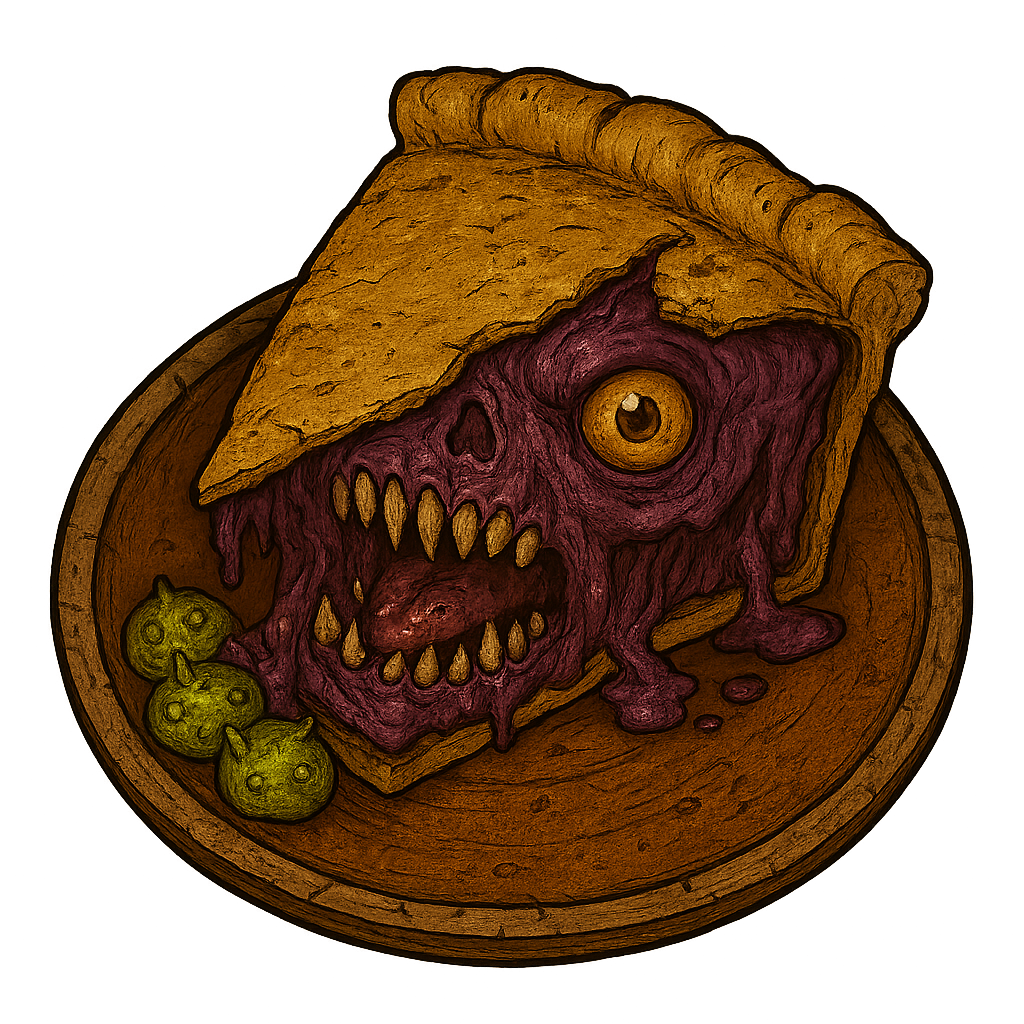A once-banned delicacy now found in rogue kitchens and dark festivals. This pie is filled with fermented ape brains, pickled nerve roots, and screamberry syrup. When sliced, the filling lets out a faint wail. Some say the pie watches you. Traditionally served with candied goblin heads for texture and insult.