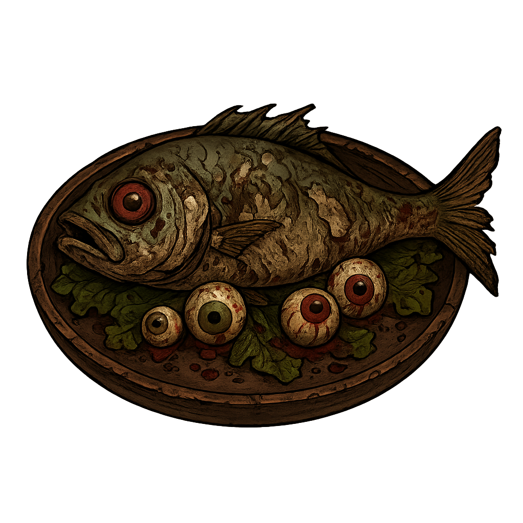 This unsettling delicacy features a whole river pike, slow-roasted in bark ash and served on a bed of swamp greens. The true highlight of the dish, however, lies in the garnish: a selection of pickled predator eyes, harvested from wolves, hawks, and other sharp-sighted beasts. These orbs are soaked in a brine of fermented bloodvine and bog salt to preserve their bite.
