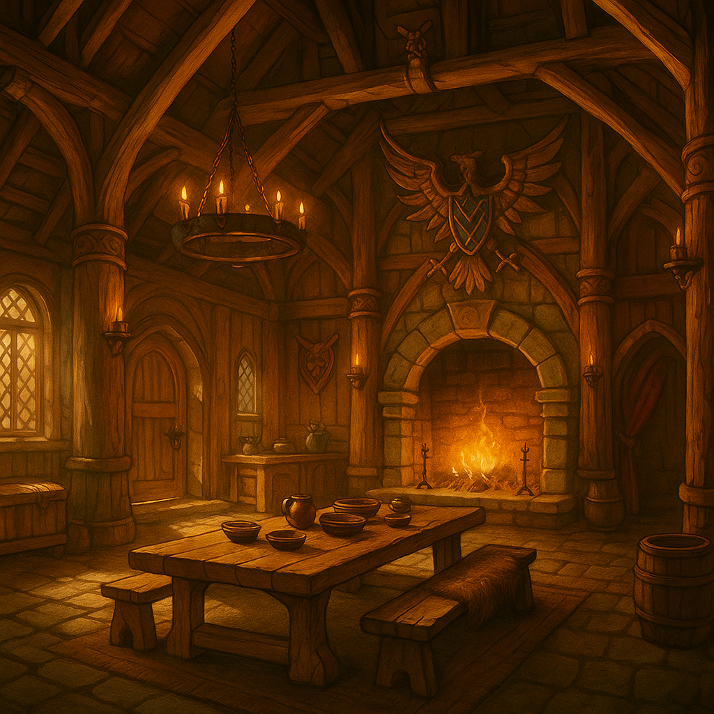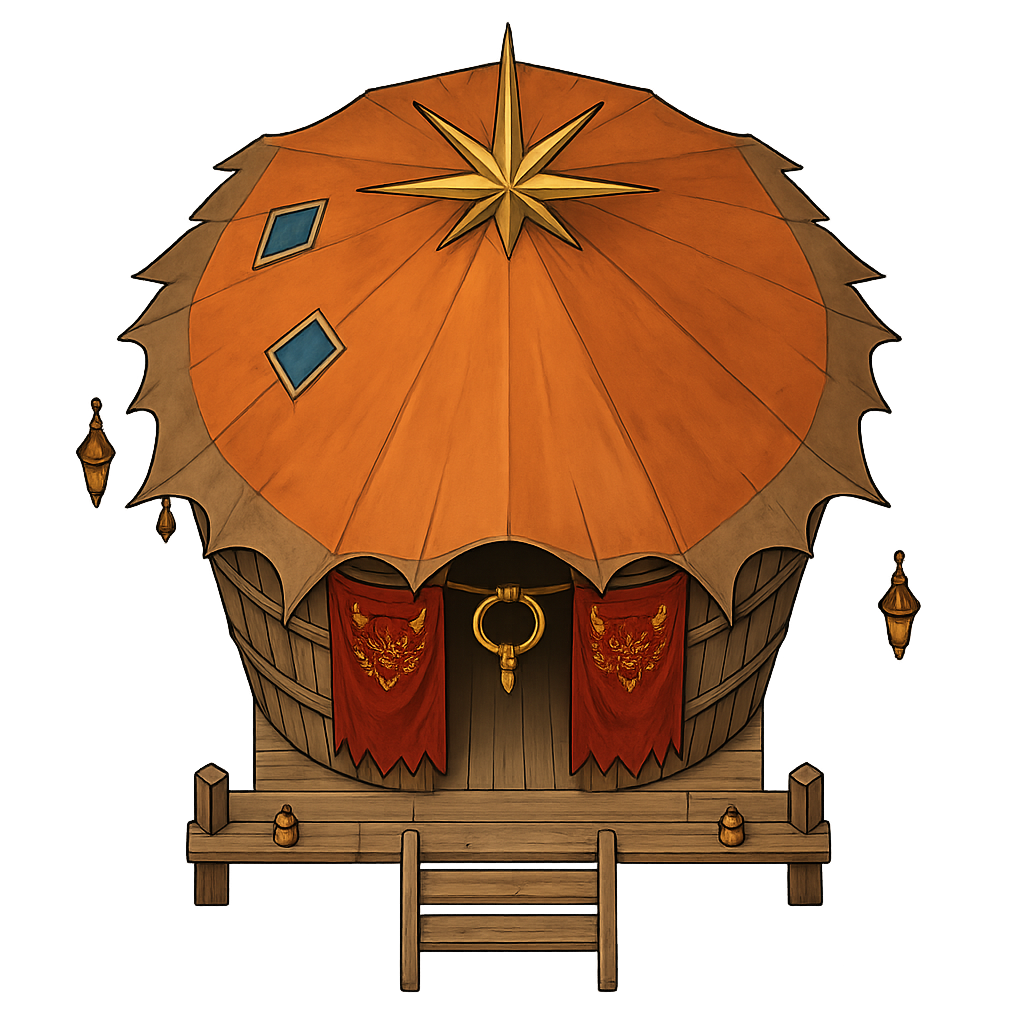 A semi-permanent structure with a sturdy wooden frame and sloping roof that mimics the tent’s silhouette. Often covered in hides or dyed cloth. These lodges house families, administrators, or respected elders. Clan colors and symbols are clearly visible.