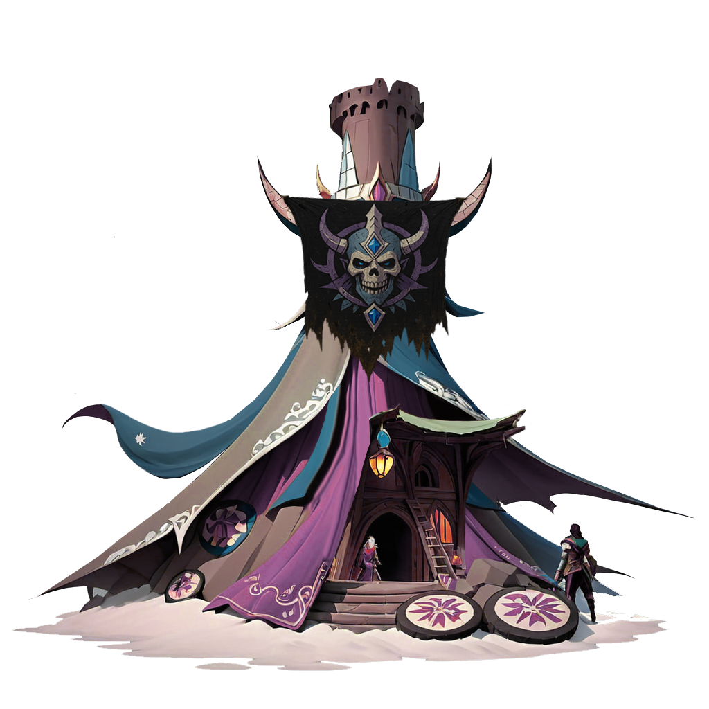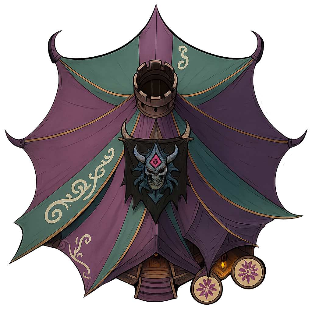 Aerial tacticians and skeletal crafters who see death as legacy in flight. Their tents rise like wings—wide, high-arched, and decorated with feather-bone structures. Banners stretch between poles like airborne sigils. Leadership is earned through acts remembered in sky-song and ritual display.