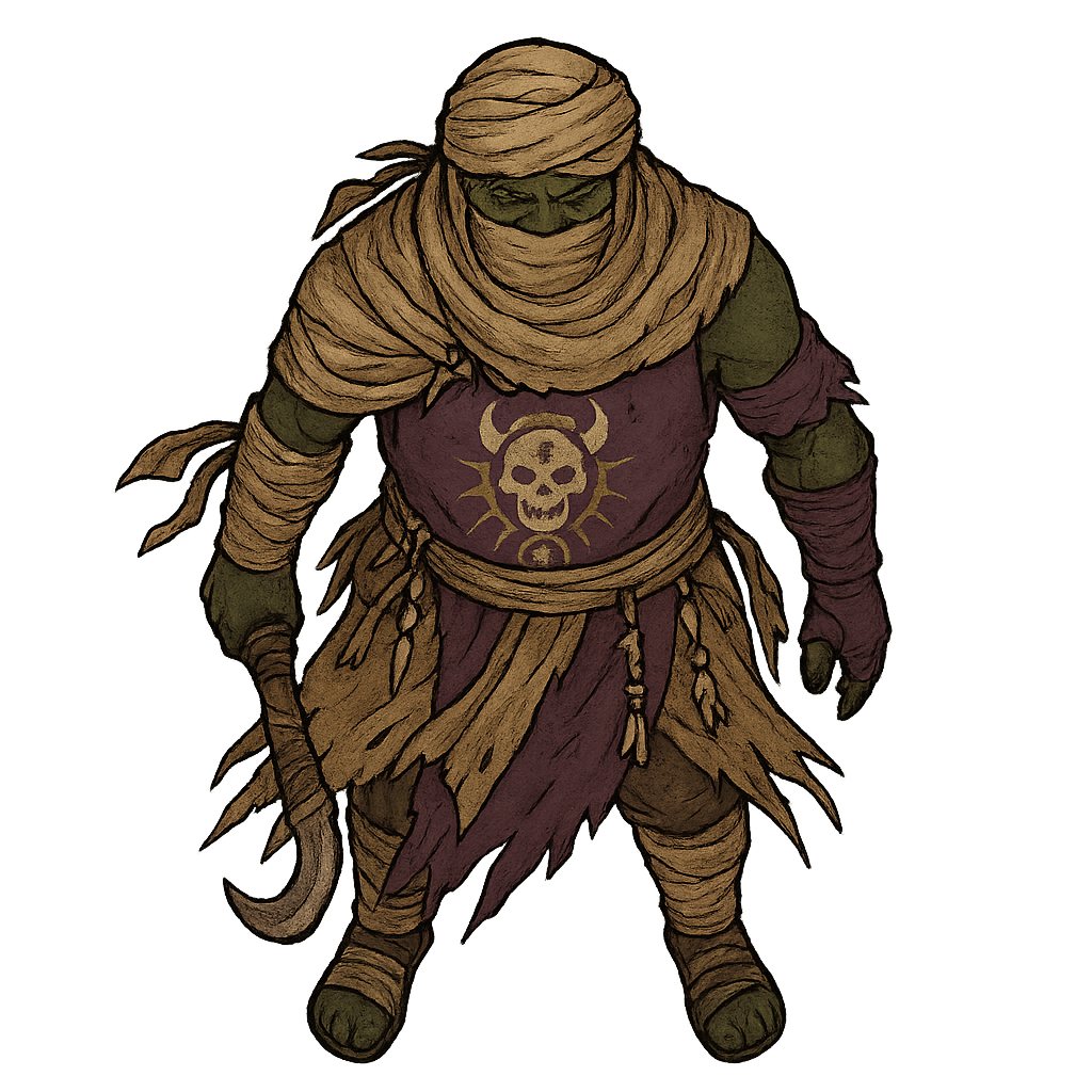 Nomads of the desert, masters of embalming, medicine, and long-distance survival. To them, death is a passage through sand and time. Their caravans are ringed with bone-framed tents in sand tones, marked with spirit charms and wind cloths. Preserved ancestors are carried within special ritual tents, and leadership flows through mummified councils interpreted by living guardians.