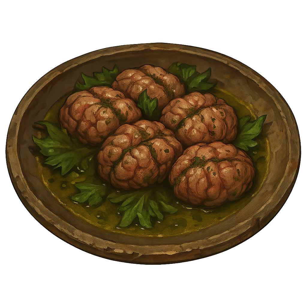 This traditional orcish starter features five boiled boar brains, carefully plated on a bed of wild greens and soaked in a thick, fermented herb slime. The brains are harvested fresh, preferably while the boar is still twitching, to preserve the full texture and essence. Served cold, it’s often eaten as a ceremonial first course during victory feasts or funerals.