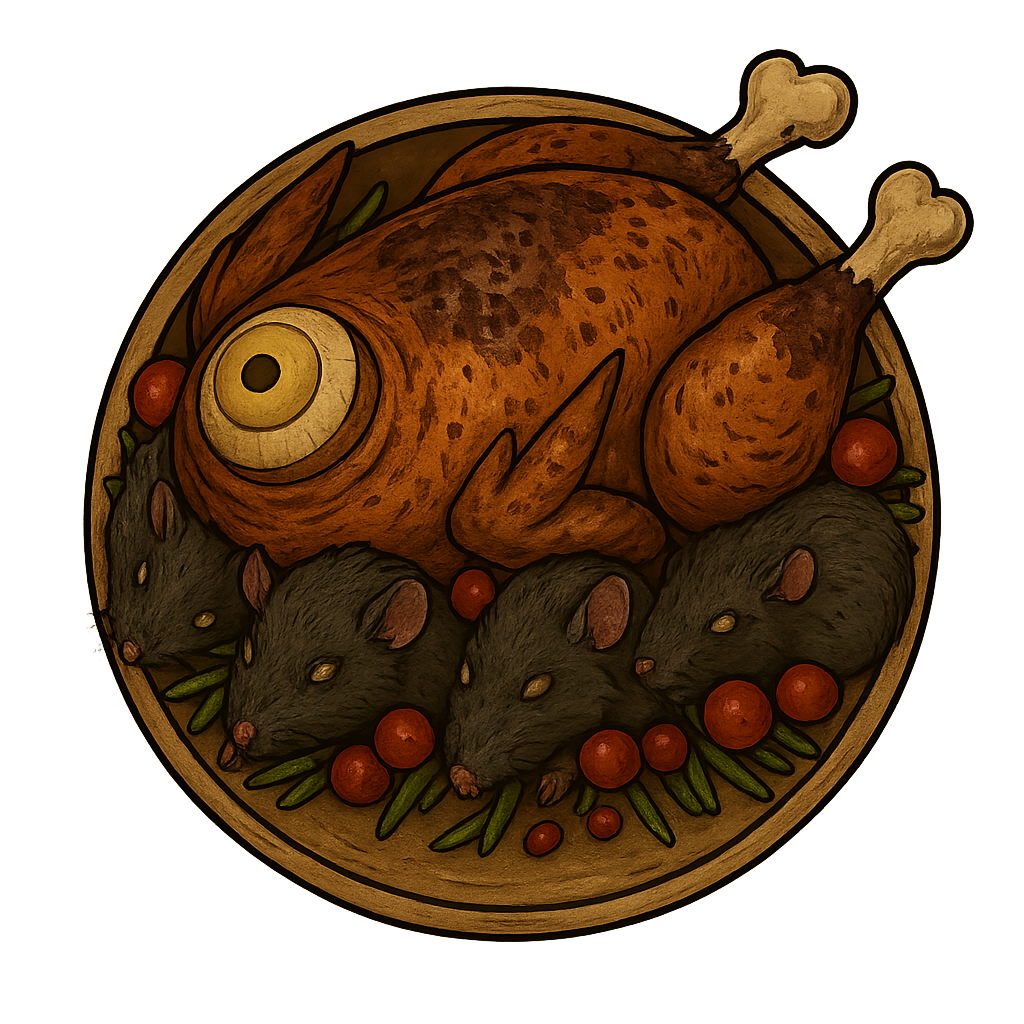 A festive centerpiece dish served during blood feasts and hunting celebrations. This enormous roast bird, known for its single cyclopean eye, is slow-roasted until the skin crisps and the scent draws flies. Stuffed with four whole swamp rats and surrounded by fermented redberries and snake beans, the dish is both a display of dominance and a test of stomach.