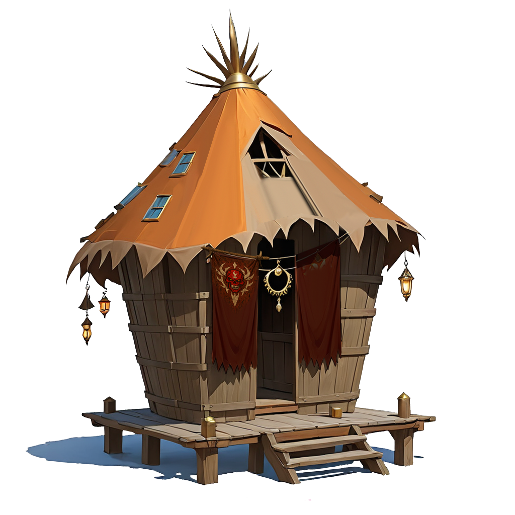 Heavily decorated and filled with ceremonial details: cloth streamers, horns, glyphs, and offering spaces. This design creates a sacred environment and reflects the user’s spiritual role. Home to shamans, spirit-talkers, or ritual guardians.